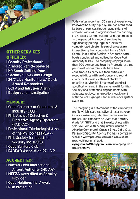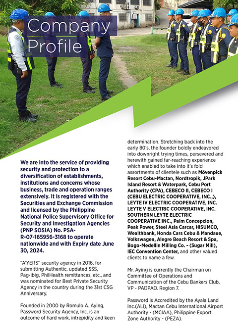 Password Security Agency Inc. - Cebu City is into the service of providing security and protection to a diversification of establishments, institutions and concerns whose business, trade and operation ranges extensively. We also supply, install "quality and reliable" CCTVs and intrusion alarms here in Cebu City and other neighboring areas.